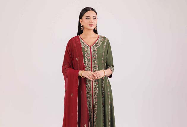 Save 35%NishatUK - Red Embroidered Karandi 3-piece ready to wear-luxury Suit