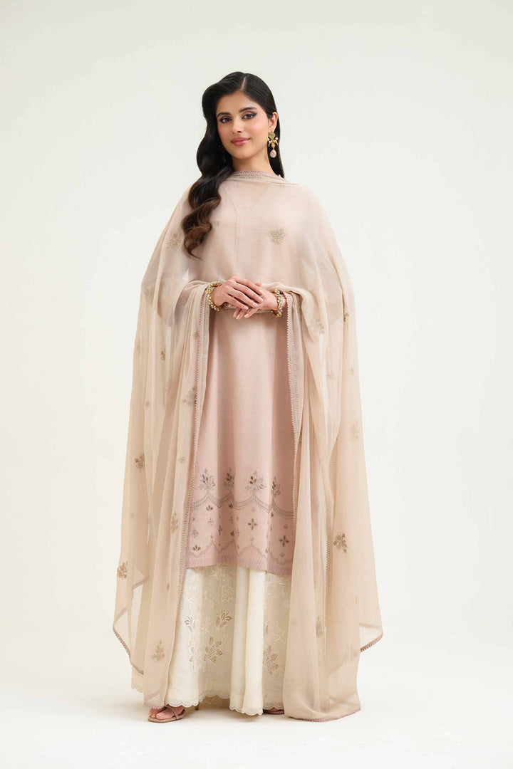 V Neckline With Placket, Frill & Lace Detail At Sleeves, Long Embroidered & Embellished Shirt