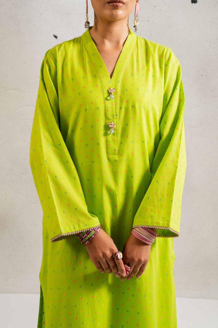 High V Neckline With Embellishment On Placket, Lace Detail At Sleeves Edges & Hem, Straight ShirtÂ