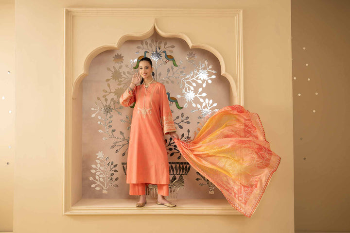 Add refined charm to your wardrobe with this printed embroidered three-piece suit from the latest Pret summer collection.