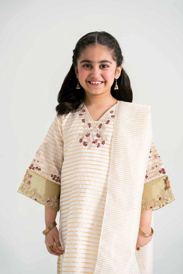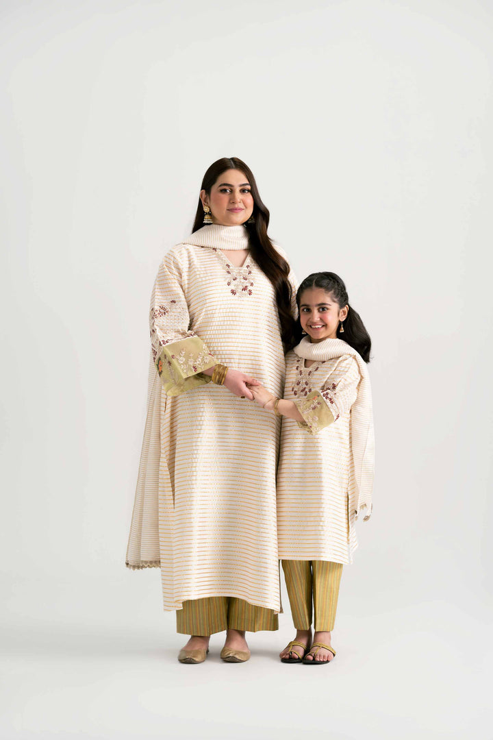 Elevate your summer style and make a lasting impression with this embroidered three-piece suit from the latest Pret Mother & Daughter collection.