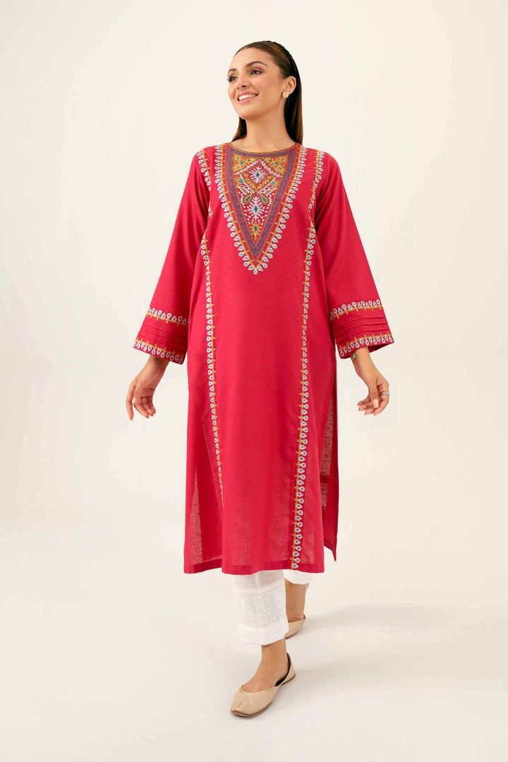 Round Neckline, Embroidered Sleeves Openings & Front, Long Paneled Shirt