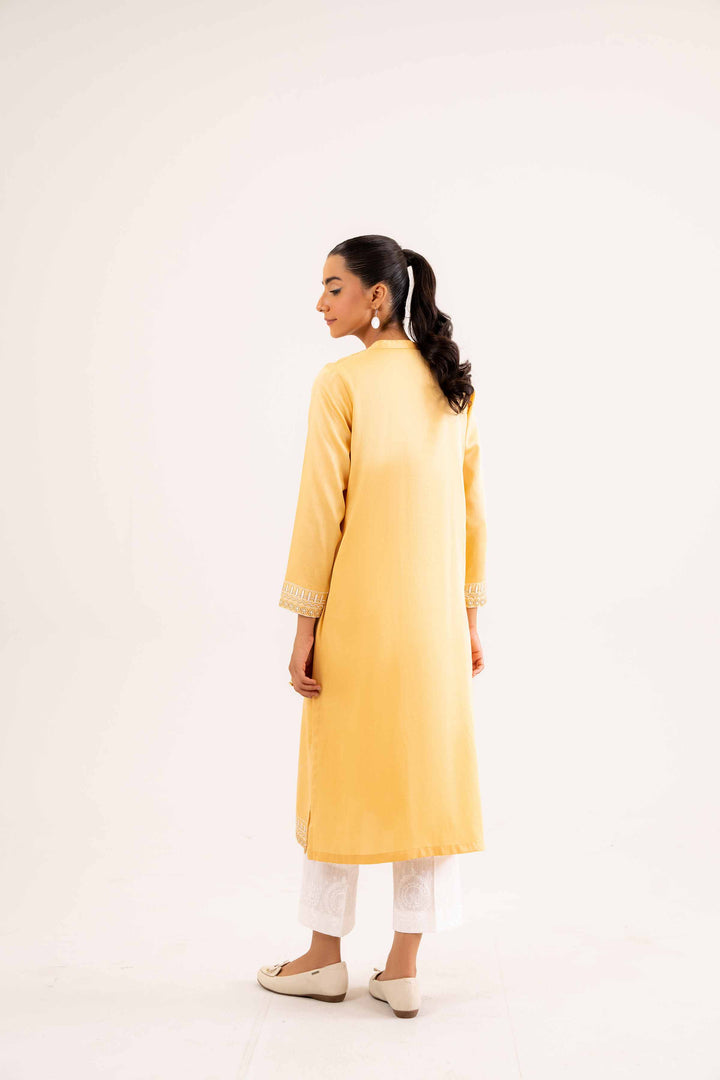 Round Band Neckline With Embellishment, Top Stitching Detail On Panels, Embroidered Neckline, Sleeves Edges & Hem, Paneled Shirt