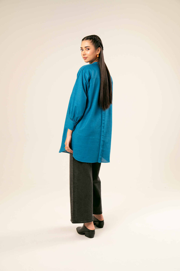 Band Neckline With Buttons Detail On Placket, Gathered Cuff Sleeves, Short Embroidered Tunic